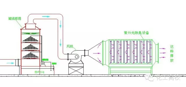 原理:反應(yīng)塔內(nèi)裝填特制的固態(tài)填料,填料內(nèi)部復(fù)配多介質(zhì)催化劑。當惡臭氣體在引風(fēng)機的作用下穿過填料層,與通過特制噴嘴呈發(fā)散霧狀噴出的液相復(fù)配氧化劑在固相填料表面充分接觸,并在多介質(zhì)催化劑的催化作用下,惡臭氣體中的污染因子被充分分解。適用范圍:適用范圍廣,尤其適用于處理大氣量、中高濃度的廢氣,對疏水性污染物質(zhì)有很好的去除率。優(yōu)點:占地小,投資低,運行成本低;管理方便,即開即用。缺點:耐沖擊負荷,不易污染物濃度及溫度變化影響,需消耗一定量的藥劑。